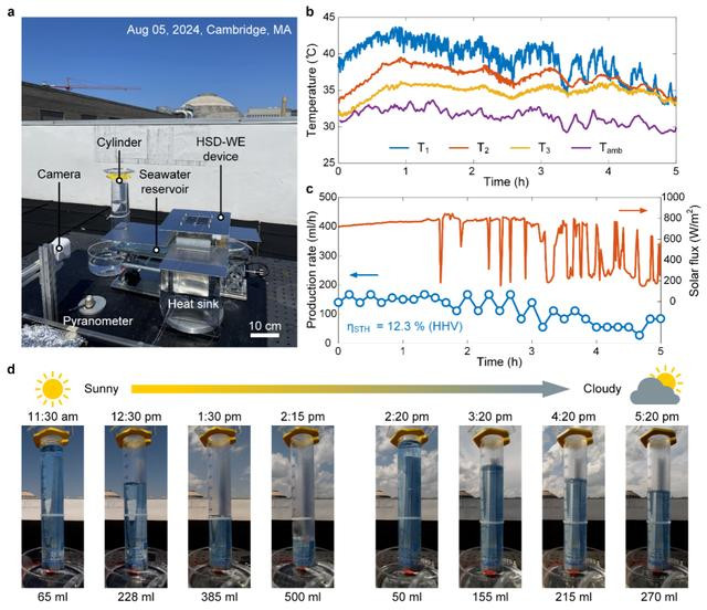 在技术研发路径上,该团队采取了循序渐进的策略。实验室阶段主要聚焦于性能优化,致力于提高单位太阳能输入的氢气和淡水产量。值得一提的是,团队此前研发的海水淡化技术创造了太阳能淡化高浓度海水的世界纪录,并获得《时代》杂志“年度最佳发明”。