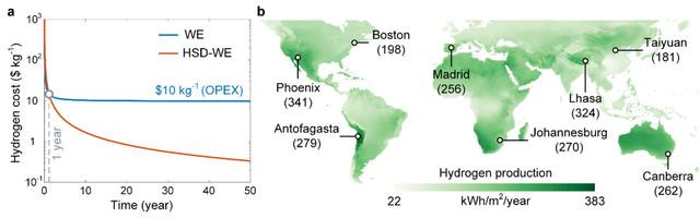 技术经济分析表明,该系统的成本优势显著:运行 3 年后绿氢生产成本可降至每公斤 5 美元,运行 15 年后成本可进一步降至每公斤 1 美元。该技术展示出商业化潜力,为未来可持续的绿氢规模化生产提供了一种经济可行的技术路径。